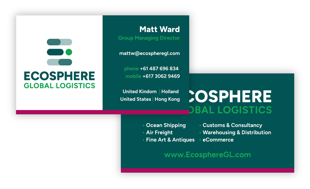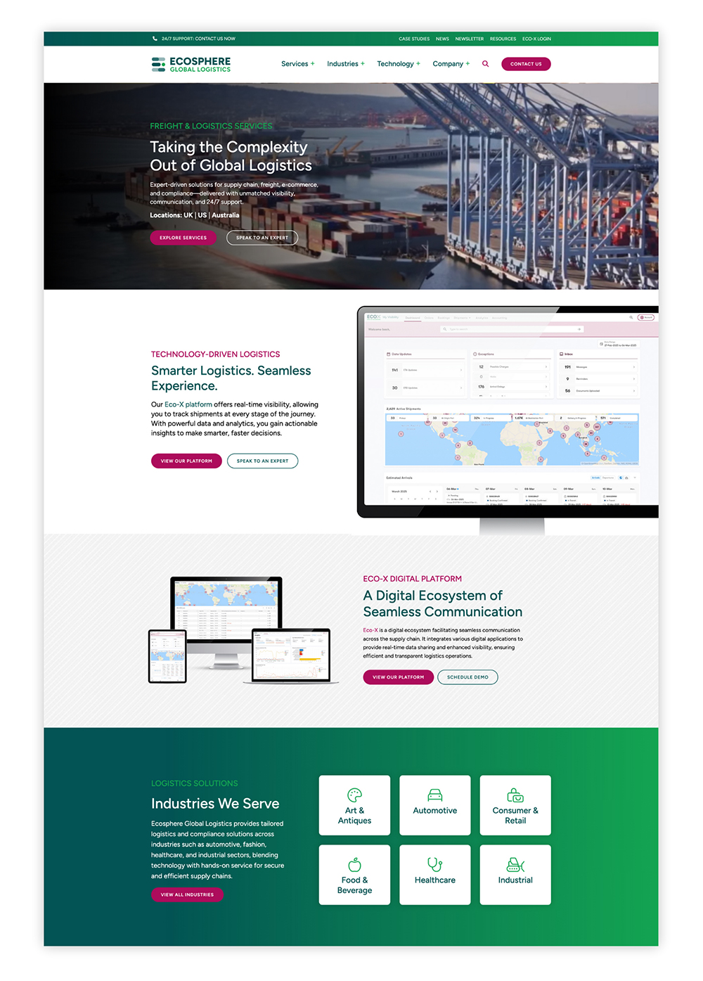 Ecosphere Global Logistics’ rebrand streamlined the company’s identity while reinforcing its role as a forward-thinking logistics partner operating worldwide. The system includes a simplified, modular logo mark, a redesigned website experience, and flexible brand applications designed for clarity, scalability, and modern digital performance across global touchpoints.